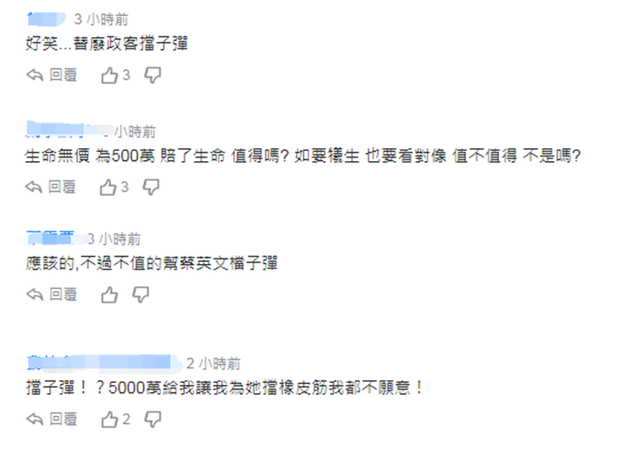 台媒曝安保人員替蔡英文擋子彈最高可獲500萬,台網友:不值得