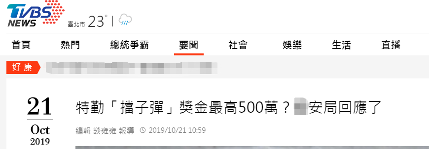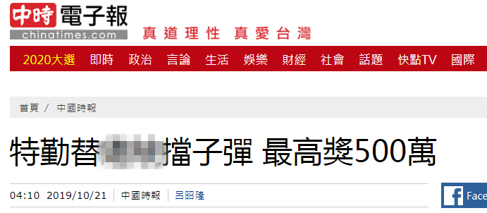 “中時電子報”報道稱,台“國安特勤單位”編有《特種勤務獎勵標準及辦法》。報道引述台“國安官員”的話稱,特勤人員若替台灣地區領導人擋子彈,獎金最高500萬。