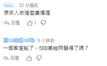 有網友感嘆:原來人命這麼廉價;一個家庭毀了,500萬能照顧的了嗎?↓