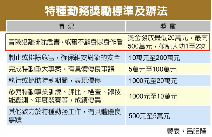 報道提及,台“國安”單位認為,這項獎勵為彰顯特勤人員具備“以身作盾”的“高尚情操”,有訂定的必要。