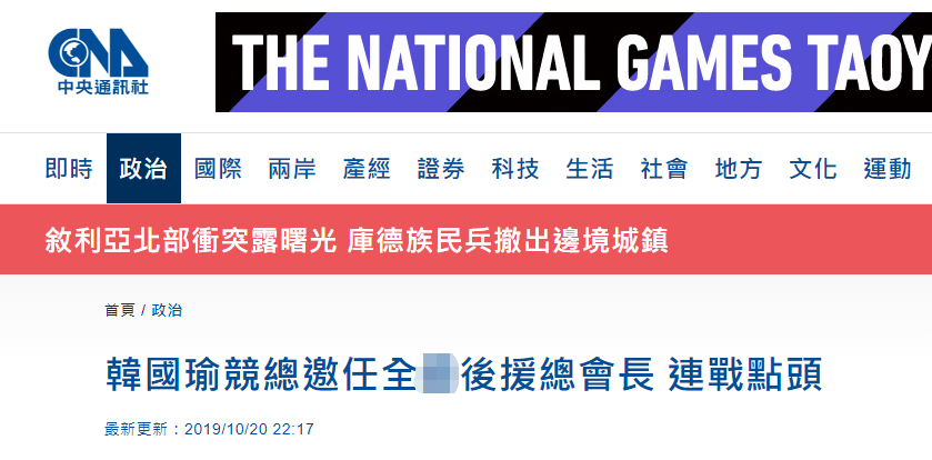 “中央社”稱,此前有媒體報道,韓國瑜設在高雄市的全台競選總部將於11月9日正式開張,全台競選總部主委、全台“後援總會長”、全台“顧問團總團長”規劃分別由國民黨前黨主席連戰、吳伯雄及前副主席林豐正擔任,其中林豐正已經確定。