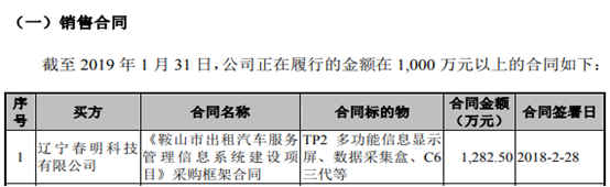 根據招股書第412頁披露,鋭明股份簽訂的大額合同中,與“遼寧春明科技有限公司”簽訂了《鞍山市出租汽車服務管理信息系統建設項目》採購框架合同,合同銷售金額達1282.50萬元。