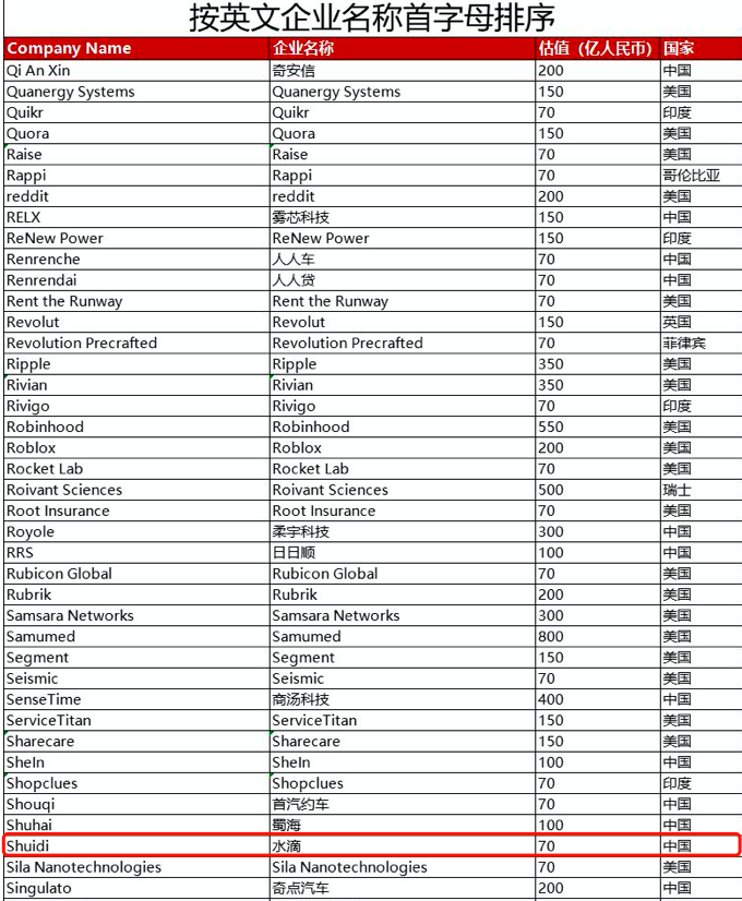 這是胡潤研究院首次發佈全球獨角獸榜,上榜企業估值都在10億美元以上,創辦不超過10年,獲得過私募投資且未上市。本次榜單估值計算的截止日期為今年6月30日。
