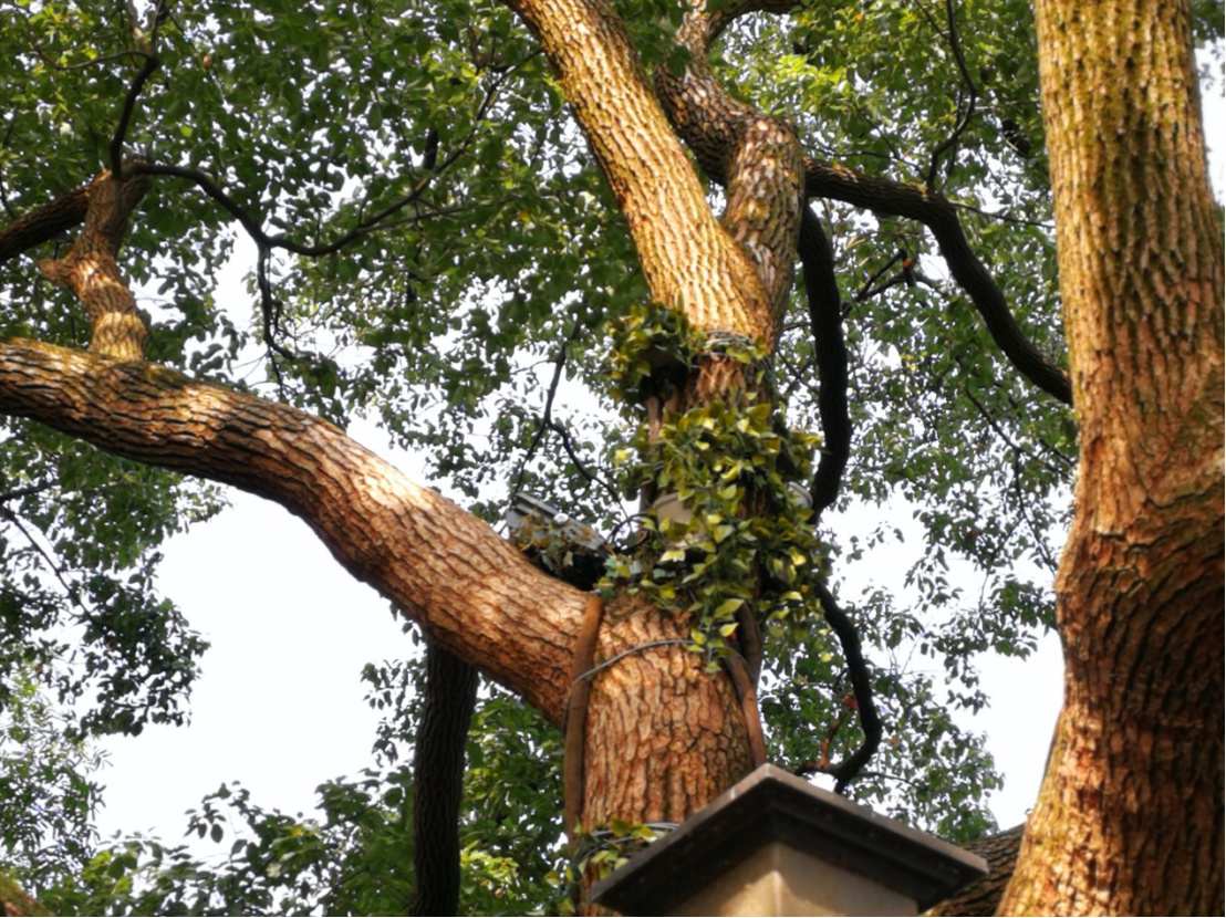 杭州鐵塔建設主管潘新楷介紹,目前包括5G、4G等747個基站都通過仿生藤、綠葉等方式隱蔽美化。由於藤蔓仿真度太高,松鼠時常會當成真樹藤啃咬“磨牙”。為了不影響樹木生長,我們定期會給樹木鬆一鬆綁帶。
