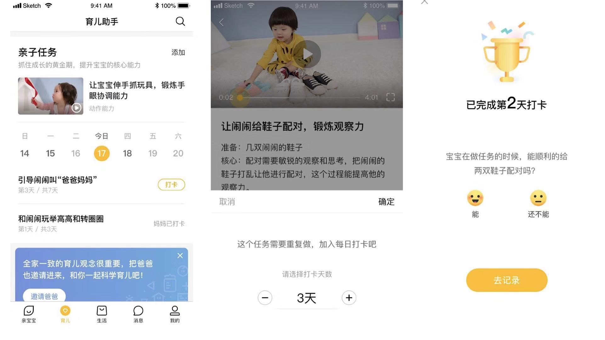 從形式上看,“親子任務”從單純的智能化推薦升級為“AI智能任務排期+家長個性化添加”的方式來設定每日打卡的內容,做到個性化的同時又不錯過寶寶成長的敏感期。一旦任務設定完畢,一個週期內的打卡任務便一目瞭然。對於寶寶的能力培養,大多數項目需要反覆練習才能夠學會。對此,親寶寶專家團表示,“當家長點擊‘加入每日打卡’按鈕之後,頁面上顯示的其實就是我們的建議打卡天數,以及打卡頻率。