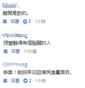 對於蘇俊豪的決定,島內網民反應不一。有人表示:離開是對的;綠營難得有個腦袋清醒的人;恭喜認清民進黨面目↓