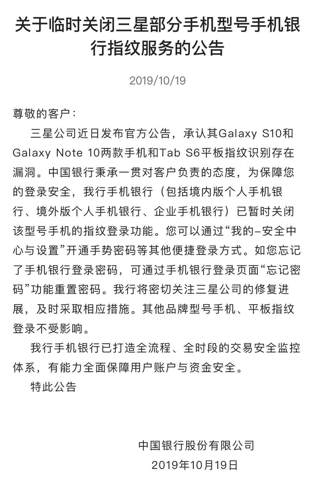 【環球網科技綜合報道】日前,三星旗下手機Galaxy S10和Galaxy Note 10因指紋識別存在安全漏洞的問題正在逐漸發酵,在國外一些金融APP叫停面向S10用户的指紋支付後,中國銀行也於10月19日在手機客户端發佈公告顯示,因三星承認其Galaxy S10和Galaxy Note 10 兩款手機和Tab S6平板指紋識別存在漏洞問題,中國銀行決定關閉手機銀行(包括境內版個人手機銀行、境外版個人手機銀行企業手機銀行)中涉及上述機型的指紋登陸功能。