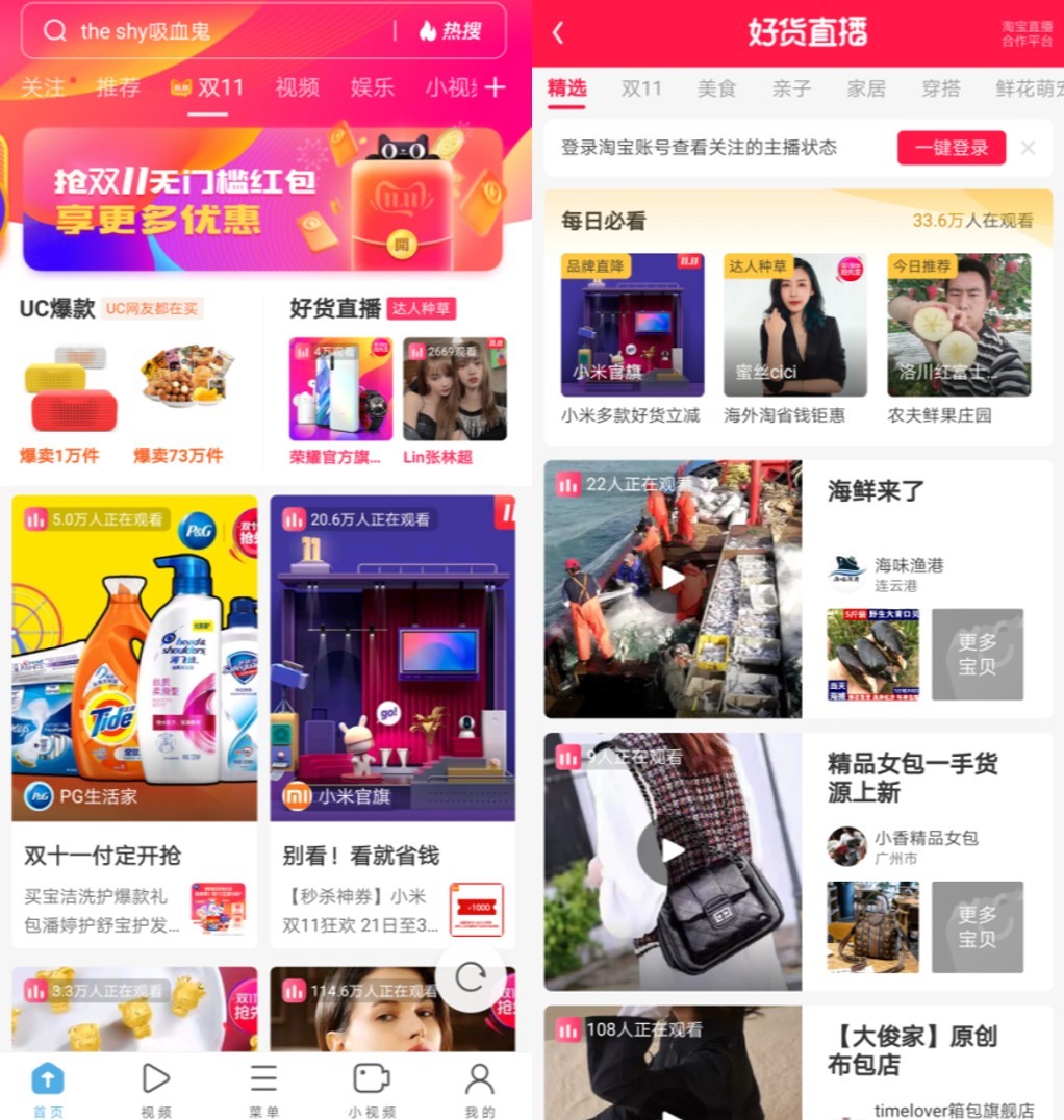 天貓雙11期間進入UC“好貨直播 ”,王祖藍、李靜、錢楓、胡可、李威等當紅娛樂明星曬出他們的剁手清單,薇婭等淘寶頂級網紅、大魚號作者和熱門商家,100多位大咖主播組成“UC薅貓毛直播紅人團”,在雙11期間帶來千場直播。