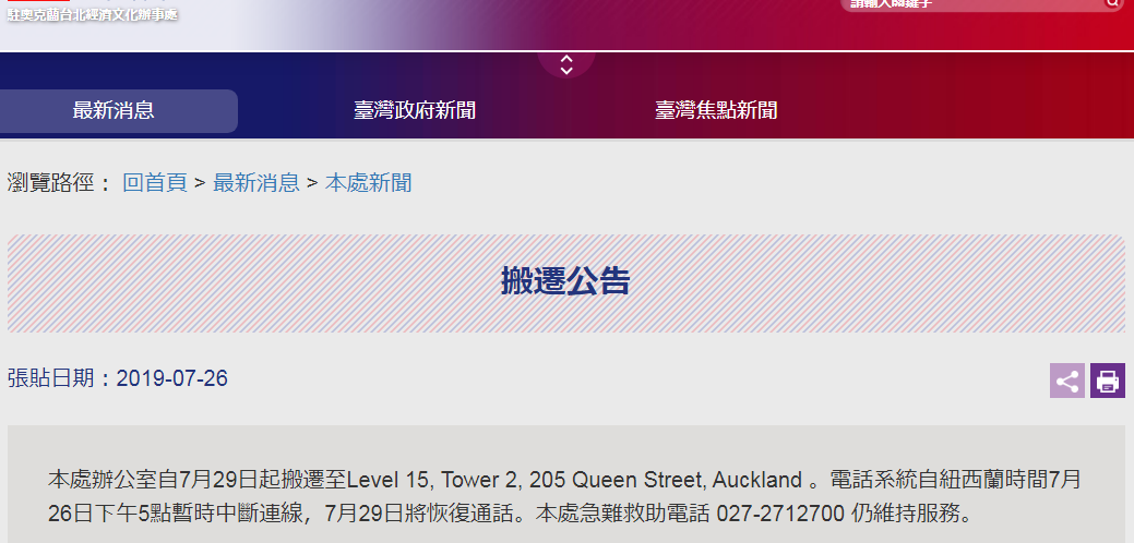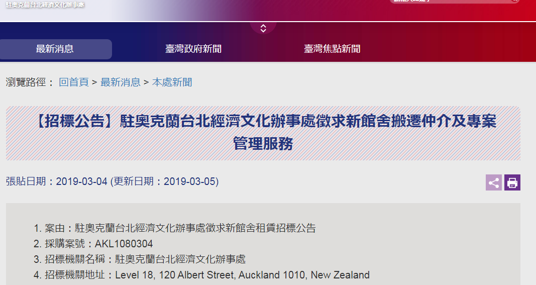 此前,台“駐奧克蘭台北經濟文化辦事處”的網站曾於今年3月刊出一則公告,聲稱其徵求新地址,隨後該網站又於7月26日刊出搬遷公告,稱會於7月29日搬遷至新地址。