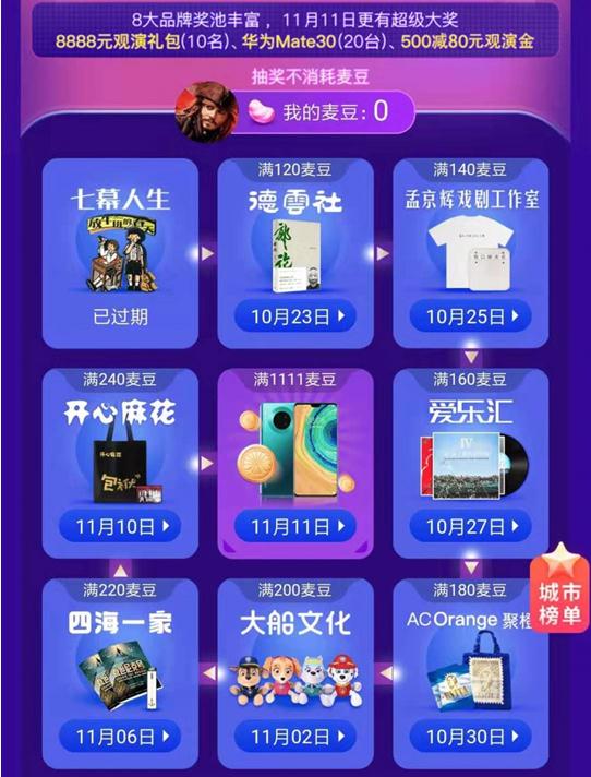 今年雙11,大麥網的核心玩法是“集麥豆 贏好禮”, 從10月20日起,用户即可通過簽到、購買VIP會員、關注品牌、搶0元票、邀請好友助力、全站購票等方式收集麥豆。凡集滿1111麥豆的用户,便有機會在雙11當天贏取超級大獎,該終極大獎包括10份價值8888的現場觀演禮包、20台華為Mate30以及滿500元減80元的劇場品類券。
