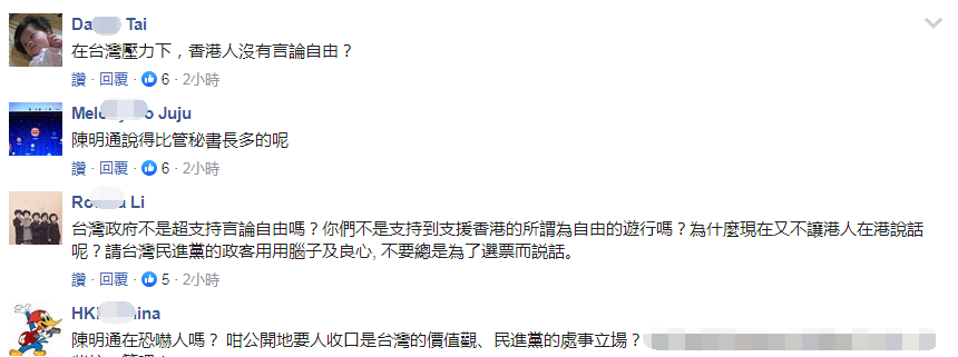 “台灣當局不是超支持言論自由嗎?你們不是支持到支援香港所謂為自由的遊行嗎?為什麼現在又不讓港人在港説話呢?請台灣民進黨的政客用用腦子及良心, 不要總是為了選票而説話。”
