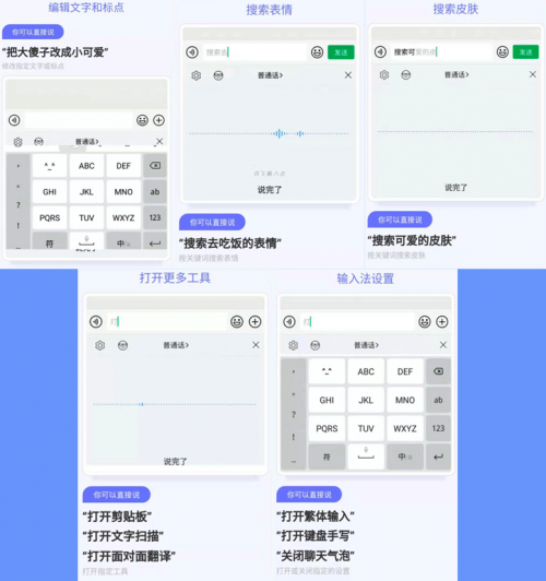 iFLYOS語義服務預計11月在訊飛輸入法上線,技能覆蓋編輯文本、搜索表情、搜索皮膚、打開輔助、個性化設置5大輸入法核心功能。語義服務將通過語音口令訪問,或使用“小飛小飛”喚醒來明確語音口令。