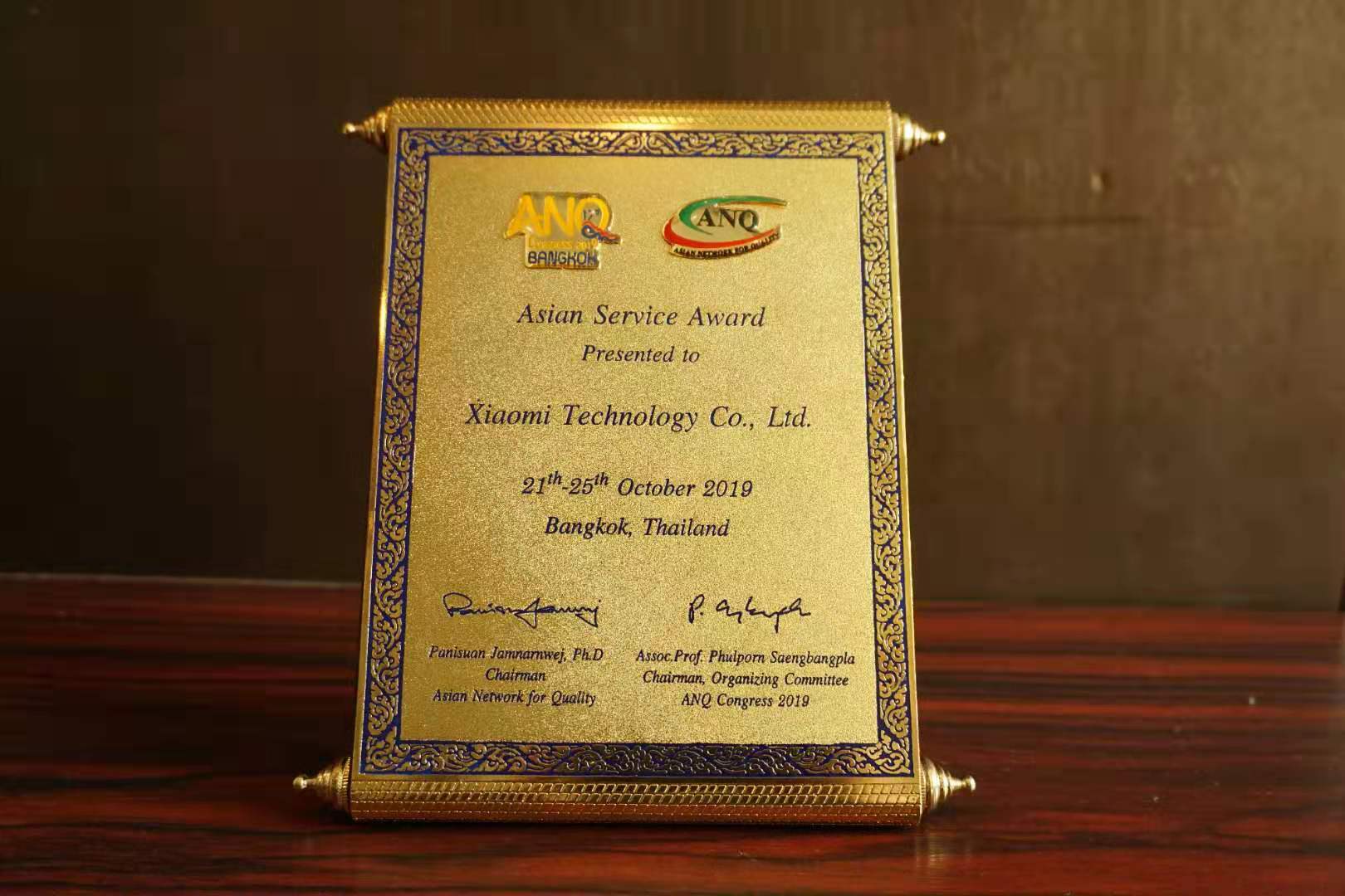 10月21日-25日,2019年亞洲質量網組織大會在泰國曼谷召開。會議主題為“質量創新,實現可持續發展”。本次會議授予小米集團 “亞洲服務獎”。作為互聯網企業代表,小米質量服務成績再次被認可。