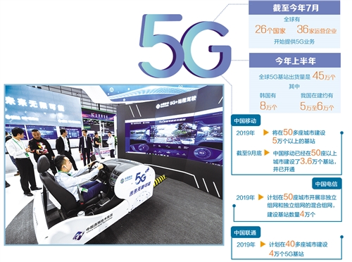 目前,運營企業相繼發佈了5G品牌和計劃。“中國移動的5G建設起步早,投入大。”中國移動研究院副院長黃宇紅介紹説,在投入方面,中國移動明確2019年將在50多座城市建設5萬個以上的基站。截至9月底,中國移動已經在50座以上城市建設了3.6萬個基站,並已開通。