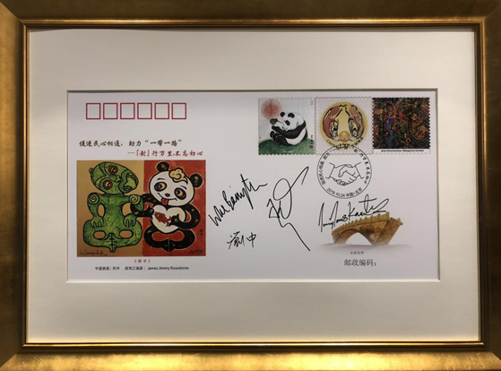 “‘封’行萬里,不忘初心”系列之中國-新西蘭紀念封主圖《攜手》由中國美術家協會理事、中國郵政成都“熊貓郵局”名譽局長劉中和新西蘭毛利族畫家詹姆斯(James Jimmy Kouratoras)共同創作,郵票附圖由劉中的《熊貓》和詹姆斯的《來自西方的信息》構成。