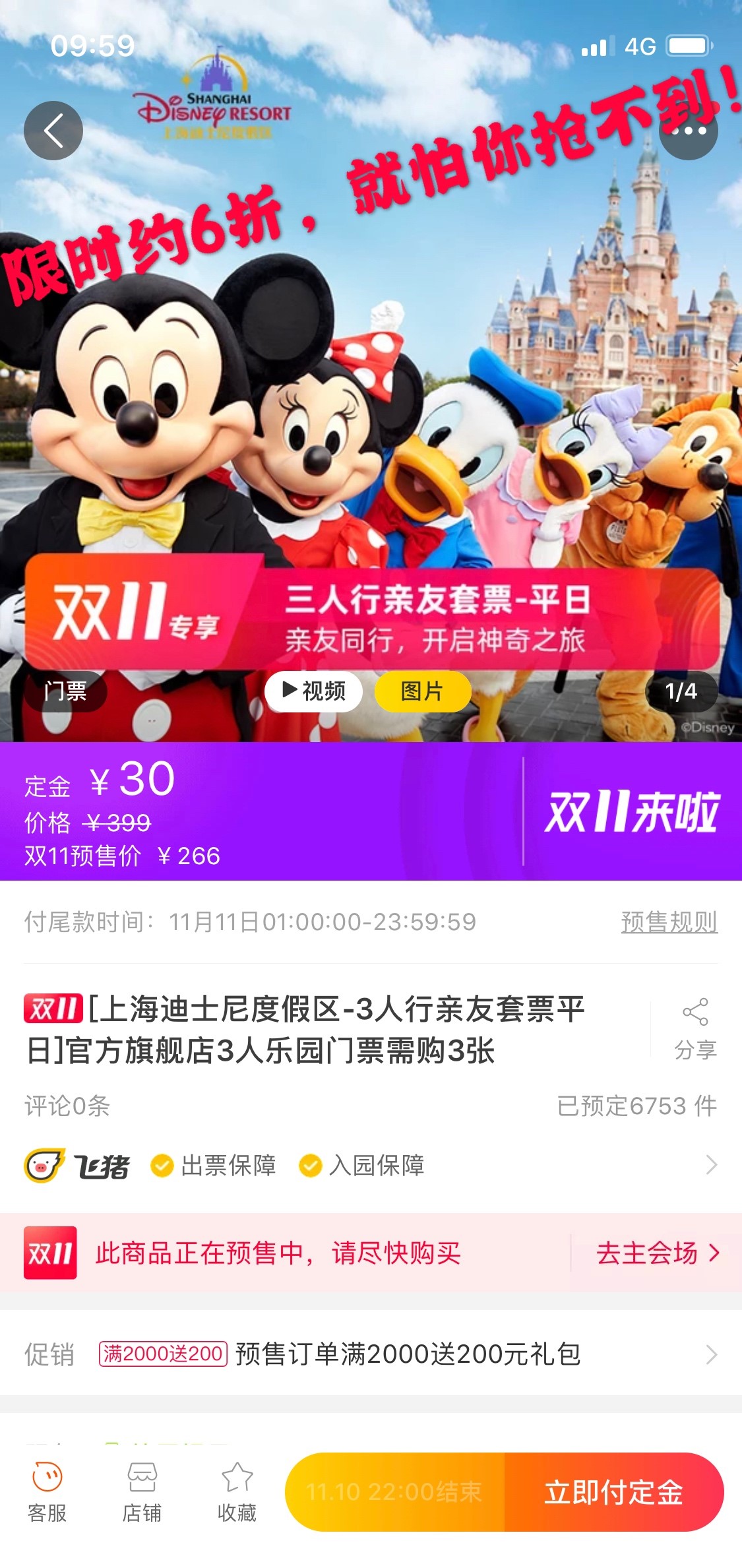 天貓雙11期間,上海迪士尼平日入園三人套票專供折扣,在官方旗艦店首發限時特惠266元/人,約相當於日常價的6折!