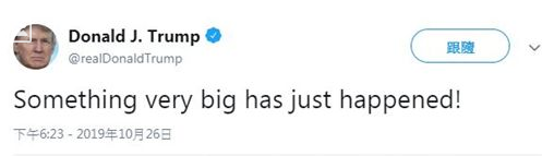 美國白宮發言人霍根·吉德利(Hogan Gidley)10月26日稱,特朗普計劃於美國東部時間27日上午9時(北京時間27日晚上21時)在白宮發表“重要聲明”。在此之前,特朗普的推特賬號上也曾發佈一條消息:“剛剛發生了一件重大的事情!(Something very big has just happened!)”