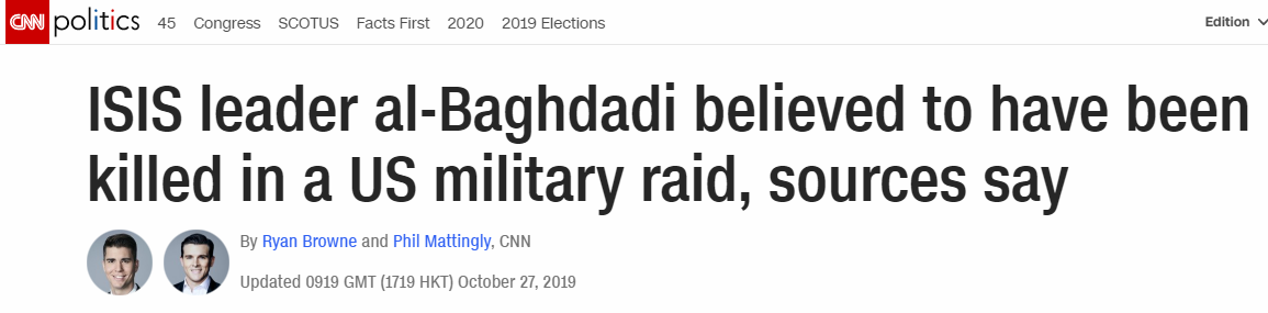 雖然霍根和特朗普本人尚未透露“重大聲明”會與什麼事情有關,但由於多家外媒報稱恐怖組織“IS”頭目巴格達迪(Abu Bakr al-Baghdadi)在美軍行動中死亡,大部分台媒在報道特朗普即將發表聲明一事時,都把聲明內容和巴格達迪死亡消息結合起來。