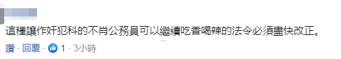 還有人對陳姓專員還能繼續領工資一事怒批:太扯了;開除,薪資討回。更有人批評島內法規讓不肖“公務員”可以繼續吃香喝辣們,“必須儘快改正”。