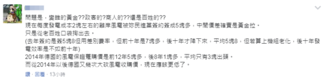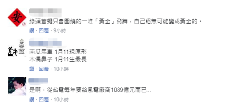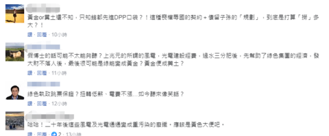 還有網友本着求證的態度,真誠發問,“問題是,變誰的黃金?政客的?商人的?還是百姓的”,網友還表示現在每度發電成本2元左右的離岸風電被民進黨簽約成5元多,中間價差確實是黃金啦。