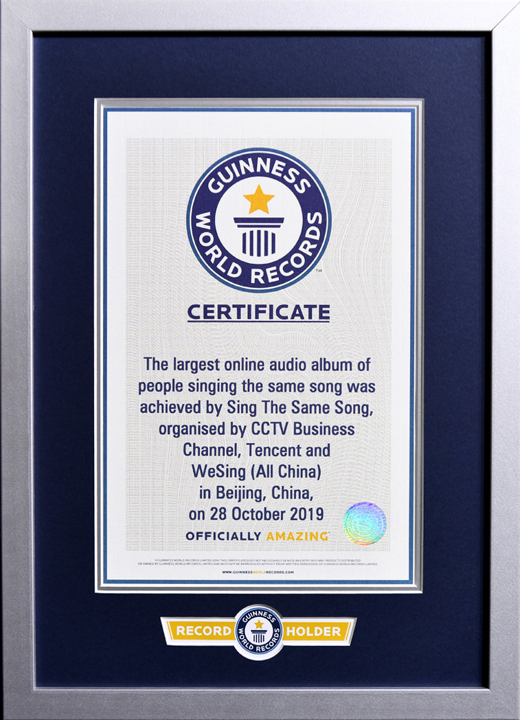 最終,經過第三方技術查重、人工審查以及吉尼斯認證官的嚴格審核,“同唱一首歌“活動已成功創造並打破了一項新的吉尼斯世界紀錄™稱號——最大的同唱一首歌線上音頻集(Largest online audio album of people singing the same song)。