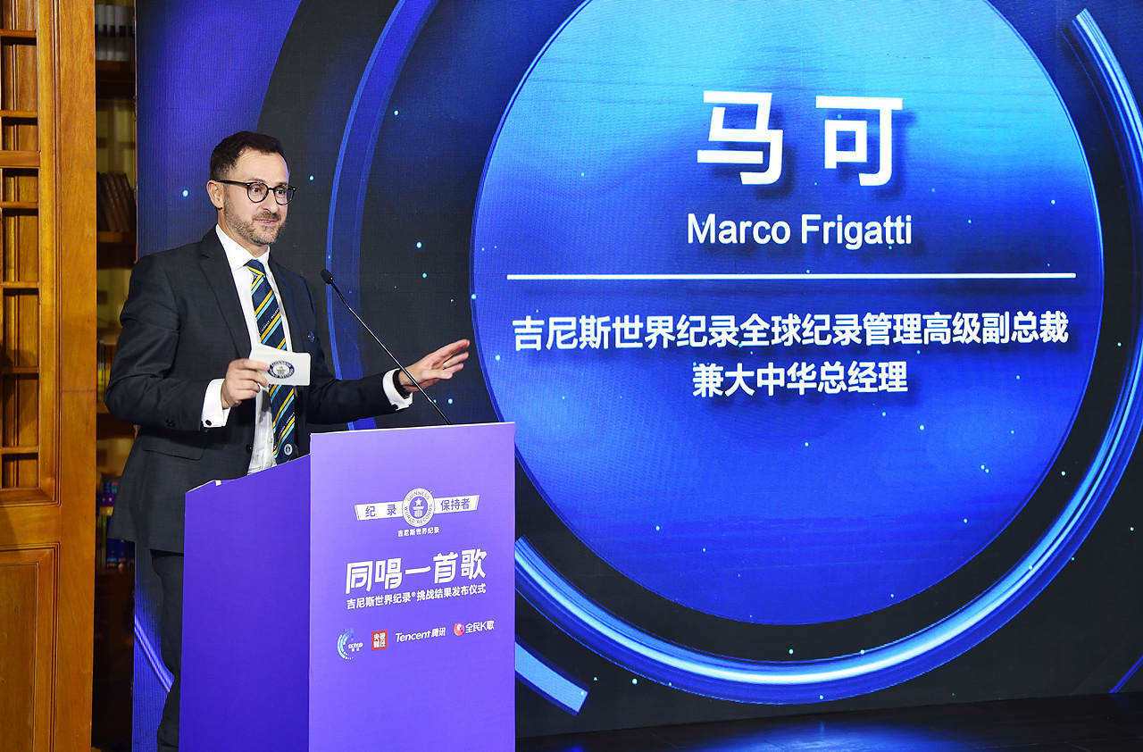吉尼斯世界紀錄全球紀錄管理高級副總裁兼大中華總經理馬可(Marco Frigatti )出席活動,見證了這項新的世界紀錄的誕生。吉尼斯世界紀錄總裁Alistair Richards表示:“起源於英國的吉尼斯世界紀錄,現已被公認為全球紀錄認證的權威機構,旨在鼓勵所有人以正向積極的方式,超越自我、挑戰極限,並通過認可各個領域‘之最’,來幫助人們發現自己的潛力。吉尼斯每月會收到來自世界各地的上千份申請,而其中只有不到5%的申請最終能夠成為吉尼斯的官方紀錄。隨着本次活動的挑戰成功,‘同唱一首歌’的挑戰紀錄已正式成為吉尼斯世界紀錄數據庫中的一分子。”