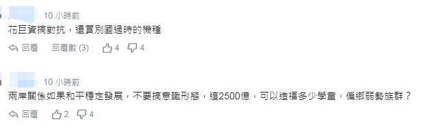 還有人批評台當局花巨資搞對抗,“還買別國過時機種”。“兩岸關係如果和平穩定發展,不要搞意識形態,這2500億可以造福多少學童,偏鄉弱勢族羣?”