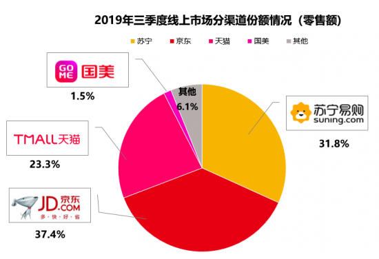 在線上市場,各渠道格局相對穩定。蘇寧、京東、天貓瓜分了92.5%的市場份額。其中,蘇寧線上渠道增速高於行業平均,京東線上渠道增長受阻,佔比不足4成,份額較半年度進一步縮減。