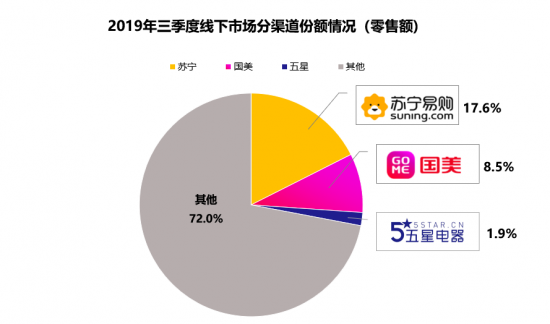 報告指出,2019年第三季度,中國家電市場零售額規模為1745億元。其中,蘇寧佔比22.6%,份額持續擴大,再度領跑全渠道第一。京東佔比13.4%,與蘇寧相差9.2%,差距進一步拉大。