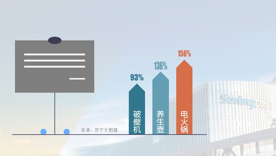 秋季,中國人對於火鍋的熱愛也可以從蘇寧大數據中窺見一斑,10月7日至10月21日,電火鍋銷量環比增長156%,購買鴛鴦鍋最多城市分別是蘇州、武漢、北京。其中,一人食小火鍋銷量環比增長209%,愛在家煮火鍋的吃貨中,65%是女性,她們最熱衷的品牌是蘇泊爾、美的、榮事達。