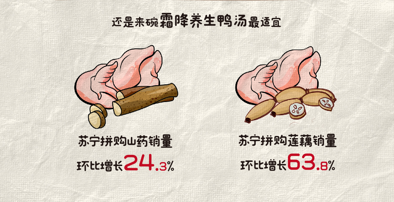 蘇寧拼購數據顯示,10月14日至23日,鴨肉環比增長334.4%,南京、北京和成都成為鴨子的圍城。養生鴨湯、啤酒燉鴨等名菜的輔佐材料走俏,山藥、蓮藕在蘇寧拼購平台分別環比增長24.3%、63.8%。蘇寧超市啤酒和料酒銷量環比增長65%和115.64%。