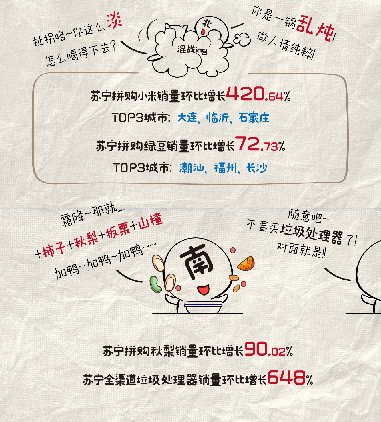 與北方喜歡單煮小米粥不同,加料粥更暖南方胃。蘇寧雙十一大數據顯示,潮汕、福州、長沙人愛買綠豆,廣州、長沙、蕪湖人愛加皮蛋,南京、徐州鍾愛秋梨。一粥百搭,可甜可鹹。