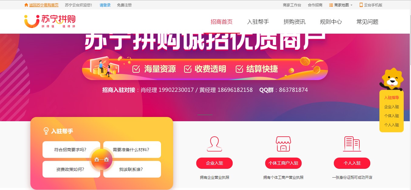 據記者瞭解,為了更好服務個人創業,蘇寧拼購趁着雙十一的東風進一步開放平台,釋放更多平台流量扶植新入住的類目商户。入駐流程非常簡便,審核期不會超過三天,費用方面,繳納2000元保證金,扣點0.6%。