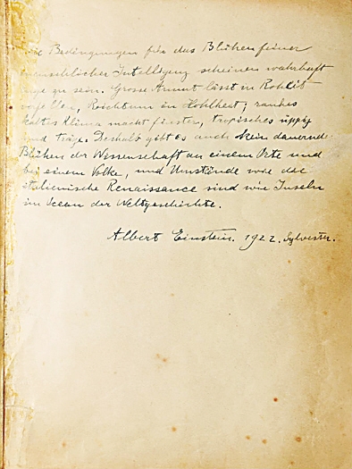 “人類智慧花朵的綻放的確受到了嚴重限制。貧窮導致人民生活水平低下,而富有又導致人民內心空虛:嚴寒的天氣使人沉鬱,而炎炎烈日又會使人驕奢淫逸、昏昏欲睡。這就是一個國家或地區不能使知識的花朵始終保持盛開的根本原因,也是能夠解釋意大利的文藝復興就像是歷史海洋中的一片小島的直接答案。”1922年除夕,愛因斯坦短暫停留上海之際,在一對長期旅居上海的猶太人特里薩·倫納夫婦家中居住,並在留言冊的首頁寫下這段話。