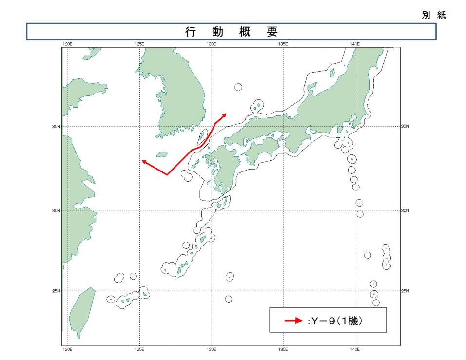 從日方公佈的中國軍機飛行路線來看,這架運-9電子偵察機從東海上空飛來,穿越對馬海峽國際空域後,進入日本海空域,隨後運-9沿原路返回。