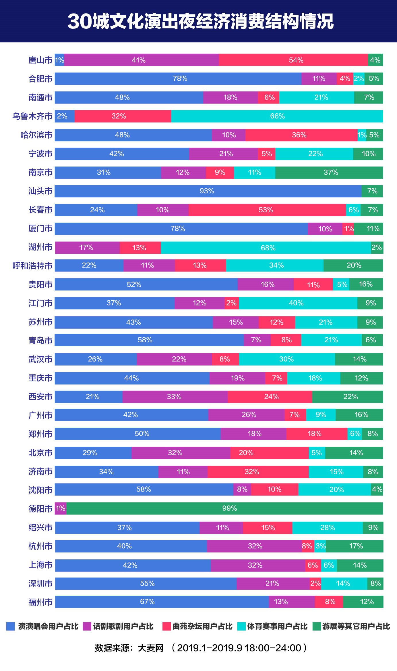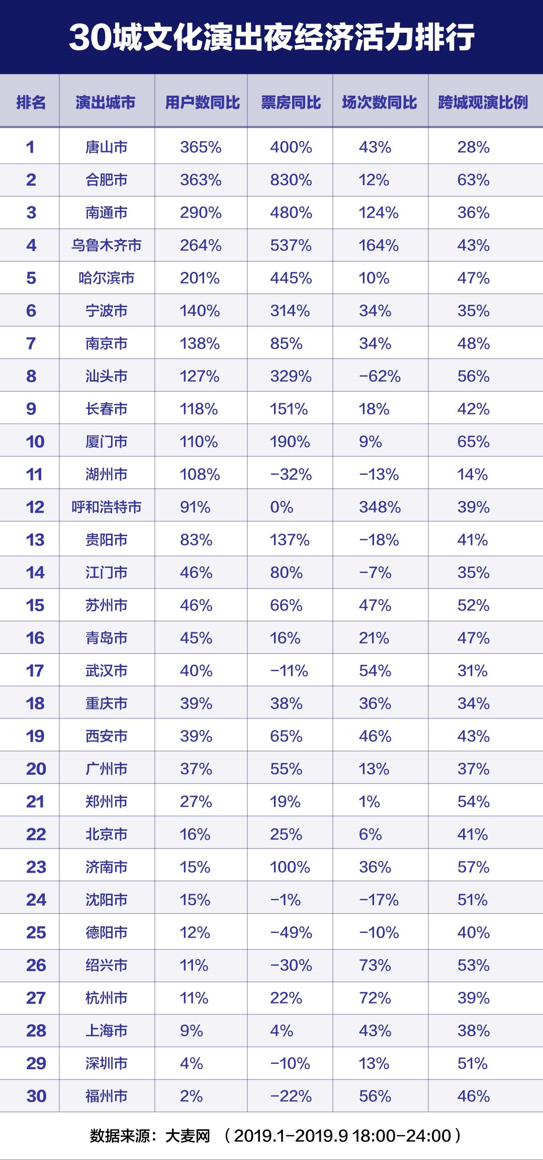 日前,大麥網發佈全國30城文化演出夜經濟活力榜單,今年1-9月,全國30城夜間文化演出觀演規模同比上漲,其中唐山用户增速最快高達365%,合肥、南通、烏魯木齊、哈爾濱緊隨其後,增速均超200%;廣州領銜一線城市夜間文化演出消費活力,用户規模同比去年提升37%,超過北京16%、上海9%、杭州11%的同比增速。