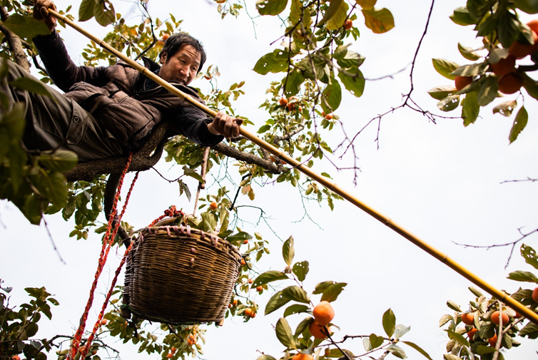 柿農爬到樹上,用特製的竹竿採摘火晶柿子。