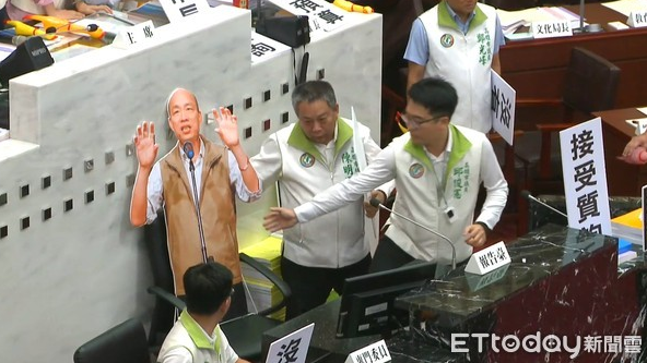 報道稱,民進黨市議員“就是要會開不下去”,而且他們還拿椅子擋住主席台兩邊通道,讓不少高雄市政府官員沒椅子坐,還帶了韓國瑜人形牌匾擺到報告台,不讓代理市長葉匡時上台報告。葉匡時進議場時,民進黨議員大喊大叫,“時代力量”一些議員也上主席台。