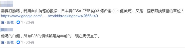 甚至有網友引用綠媒的數據直接反駁:日本買27架F35A,約花費1.1億美元。這位網友還批評,台空軍司令部又是一個睜眼説瞎話的單位!