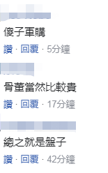 還有人直言他們是棋子,被棋手刮肉,“還要幫他辯解?”甚至還有人毫不留情諷刺稱,台軍買過季商品比買當季商品買得貴,“還洋洋得意”。