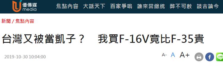 美國軍火商洛克希德·馬丁公司日前公佈其新型F-35A、F-35B戰機降價消息,單機價遠低於台軍擬採購的66架F-16V戰機及周邊裝備。島內網絡媒體“優傳媒”10月30日刊文,以此事諷刺稱,台灣又被當“凱子”?
