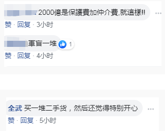 除此之外,還有不少網友諷刺台空軍司令部這種睜眼説瞎話的辯解行為。有人説,美方就是把庫存倒給台灣還收最貴的費用,“嘰嘰歪歪解釋什麼東西?”
