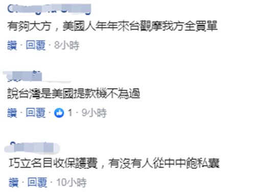 此外,報道稱,台防務部門“參謀本部”還新增了“觀摩評估與交流”的2500萬元,提供美軍觀察團赴台所需費用。對此,島內網友反諷稱:“有夠大方”,美國人來台觀摩,台灣全買單;説台灣是美國提款機不為過;還有網友直言,這是美國在“巧立名目收保護費”↓