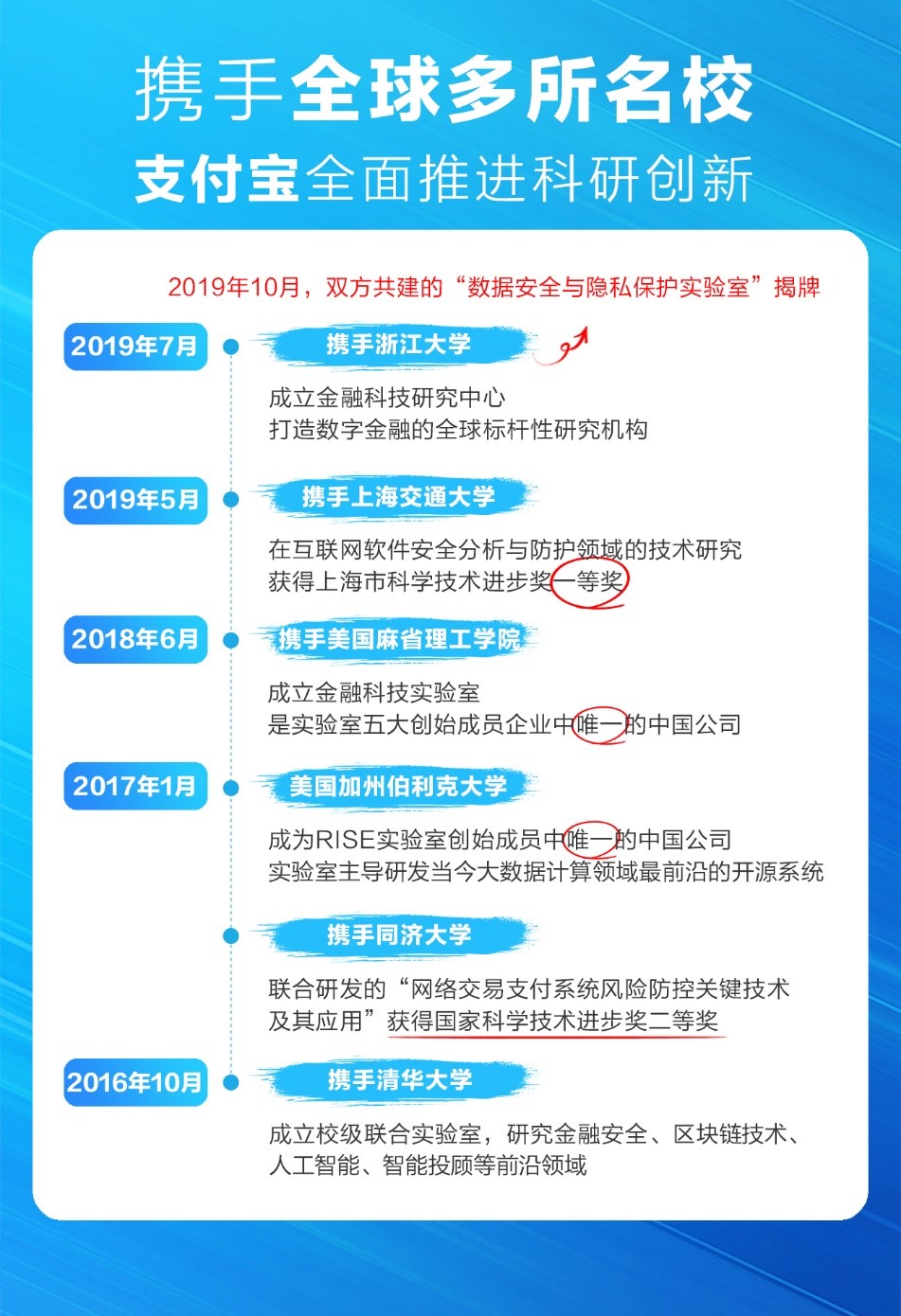 公開資料顯示,支付寶此前已陸續與清華大學、同濟大學、上海交通大學、麻省理工學院、加州伯克利大學等全球多所高校分別開展合作,並逐步取得科研成果。