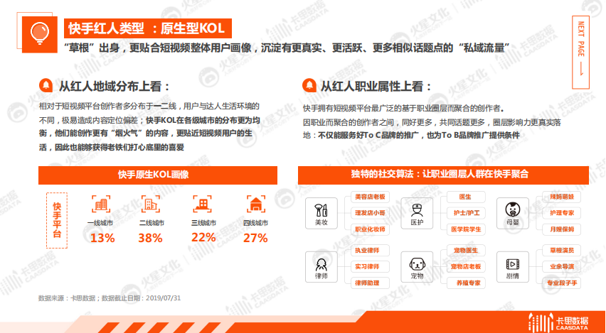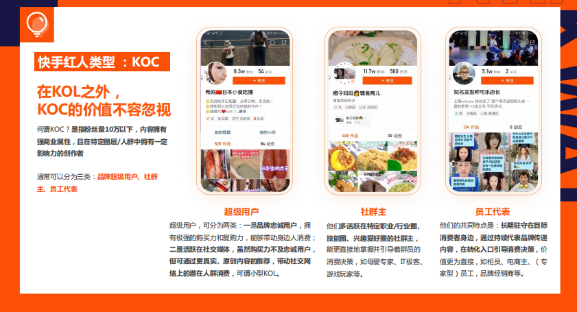 KOC是小社羣中的核心,既可以幫助品牌種草、也可養成的長效宣傳員。他們是快手平台上獨特的宣傳力量,他們可以是消費者、是影響者、是參與者、更具“信任”背書,是品牌在快手上可挖掘,也可養成的宣傳員。