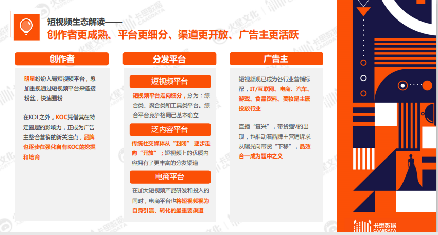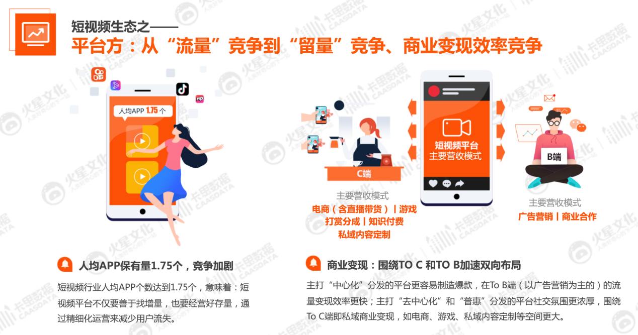 同時,短視頻生態日益完善繁榮,展示出創作者更成熟、平台更細分、渠道更開放、廣告主更活躍的趨勢。平台方方面,圍繞商業變現效率的提升,呈現出從“流量”到“留量”的競爭。主打“去中心化”、“普惠”分發的平台社交氛圍更濃厚,圍繞to C端即私域商業變現,如:電商、遊戲、私域內容定製等空間更廣闊。