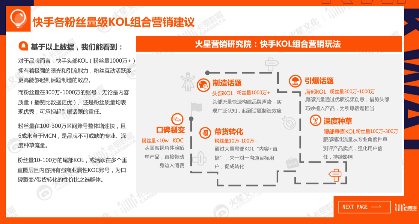 在報告的最後,卡思還給出了圍繞快手紅人投放的營銷建議。從功能屬性上來説,頭部KOL(粉絲量1000萬+) 擁有着極強的曝光和引流能力,能夠起到話題製造的效應;粉絲量在300-1000萬的賬號,無論是內容質量還是粉絲質量均表現優秀,可承擔起引爆話題的重任;粉絲量在100-300萬區間賬號整體增速快,且6成來自於MCN,是品牌不可或缺的專業、深度種草流量;粉絲量10-100萬的尾部KOL,或活躍在多個垂直圈層且內容擁有強商業屬性KOC賬號,為口碑裂變/帶貨轉化的性價比之選羣體。