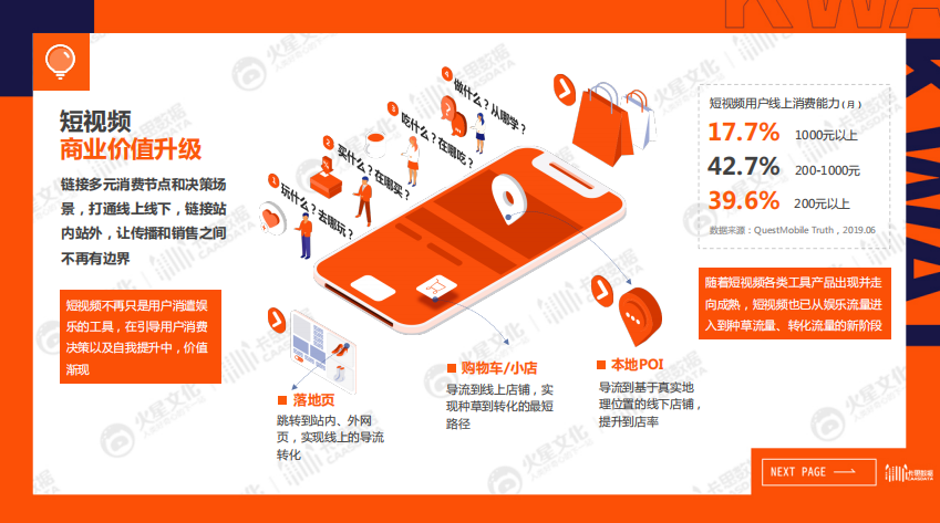 報告顯示,短視頻風頭正茂,目前月活躍用户數和人均使用時長分別達到8.21億與22.3小時,同比上漲32.3%和8.6%,呈現出明顯的增長態勢。在這樣的增長態勢下,短視頻的商業價值也逐步升級。數據顯示,42.7%的短視頻用户每月的消費在200-1000元,39.6%的用户每月消費在200元以上,17.7%的用户每月消費1000元以上,短視頻不再只是娛樂消遣的工具,而是已經從娛樂流量進入到種草流量、轉化流量的新階段。