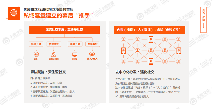 優質粉絲互動和粉絲質量的背後,是私域流量建立的幕後“推手”。首先,快手以算法賦能,基於興趣、位置、話題、關係的四大分發模式,強化社交屬性。同時,基於快手去中心化的特質,人+內容所養成的老鐵關係,時間越長,社交關係越濃厚,圍繞“社交+”所孕育的變現空間越大。
