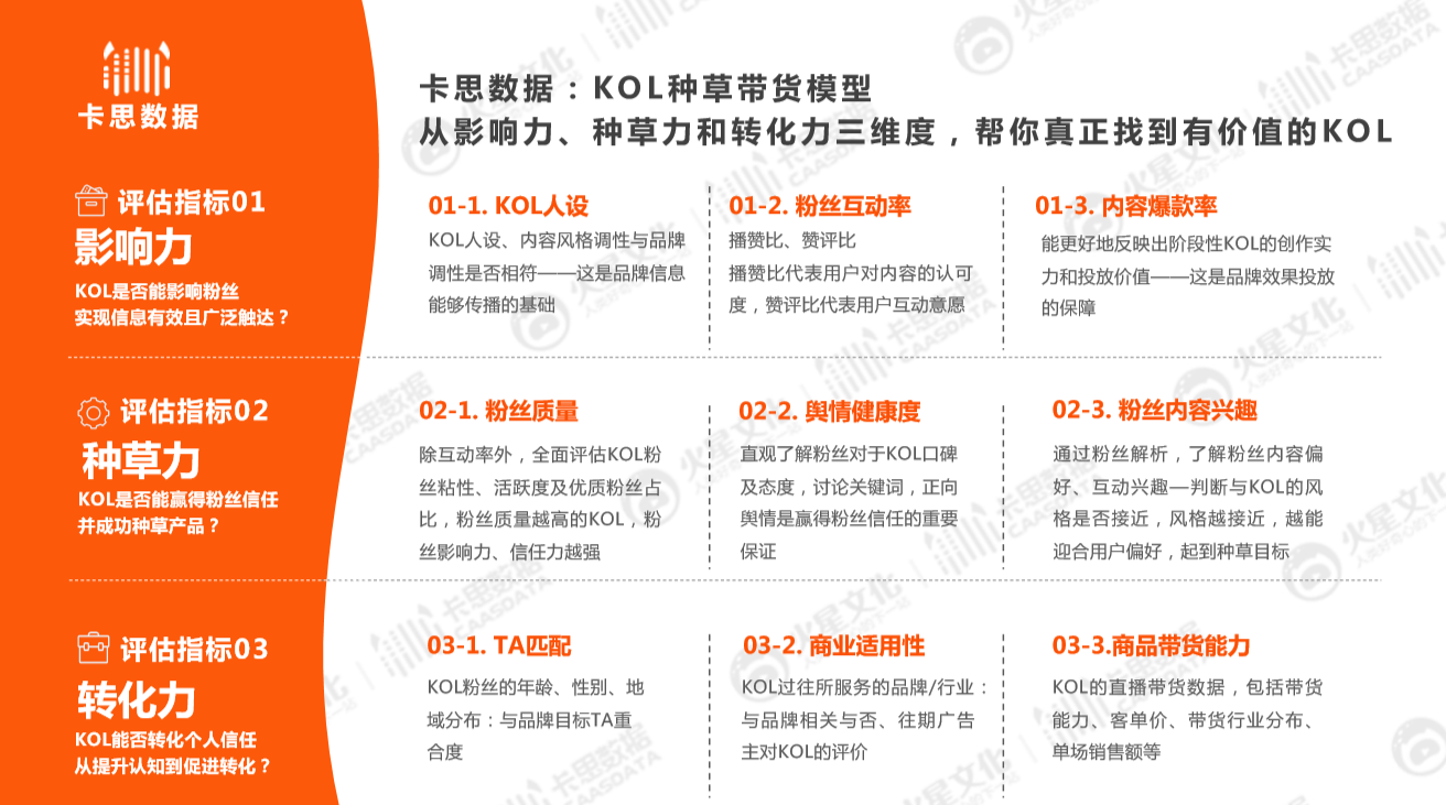 此外,報告還建議,短視頻KOL投放要保持快、準、狠的節奏,深化傳播是深度轉化的前提。從內容玩法上,要兼顧種草和帶貨,讓品牌在取得好銷量的同時,也贏得深認同,沉澱優質私域流量。同時,報告也從影響力、種草力、轉化力3大方面,9大維度,給出了全面評估快手紅人創作者商業價值的方式。